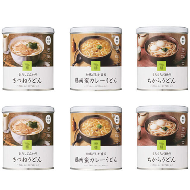「イザメシ」うどん6缶セットは、3年保存可能な長期保存食です。