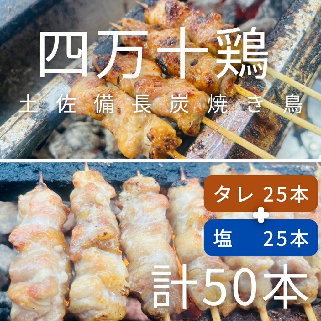 土佐備長炭で焼き上げた四万十鶏の焼き鳥50本。外はパリッと、中はジューシー。塩・たれで楽しめます。冷凍でお手軽!高知県土佐清水市