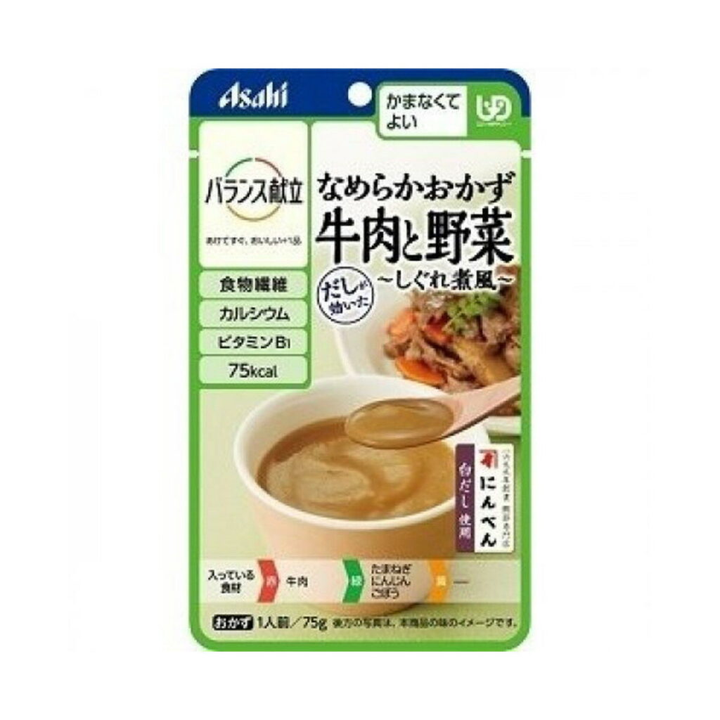 アサヒ食品の「バランス献立 なめらかおかず 牛肉と野菜 しぐれ煮風」は、75gの少...食材の宅配 -
