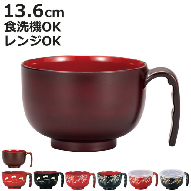 持ち手で安心!電子レンジ・食洗機対応の汁椀。桜、朱、黒などデザイン豊富。介護にも便利。BPAフリー抗菌。