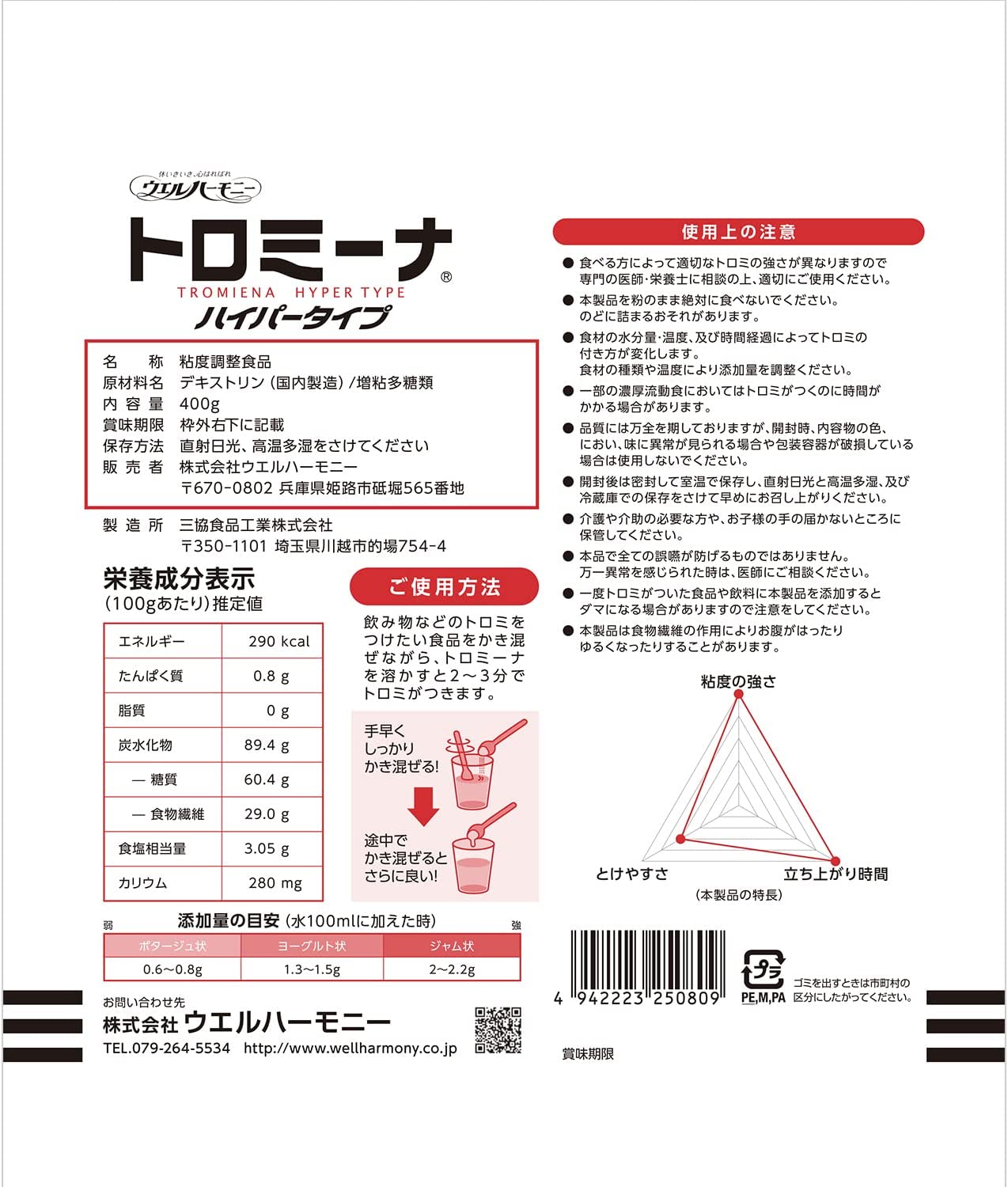 【★エントリーと店内3点購入でP10倍(11/20 20:00-11/27 1:59迄)】ウエルハーモニー トロミーナ ハイパータイプ 400g は、介護食におけるとろみ調整剤です。