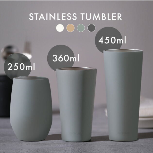250ml、360ml、450mlの3サイズ展開で、コーヒー、紅茶、ビール、お酒など、様々な飲み物に対応。