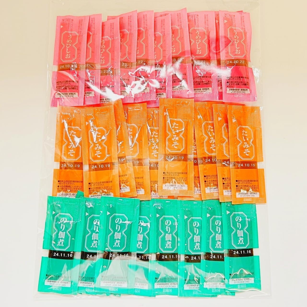 うめびしお、のり佃煮、たいみそ、3種の味が手軽に楽しめます。